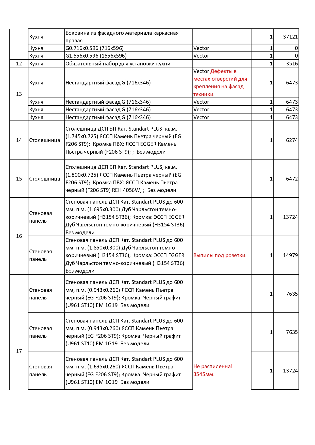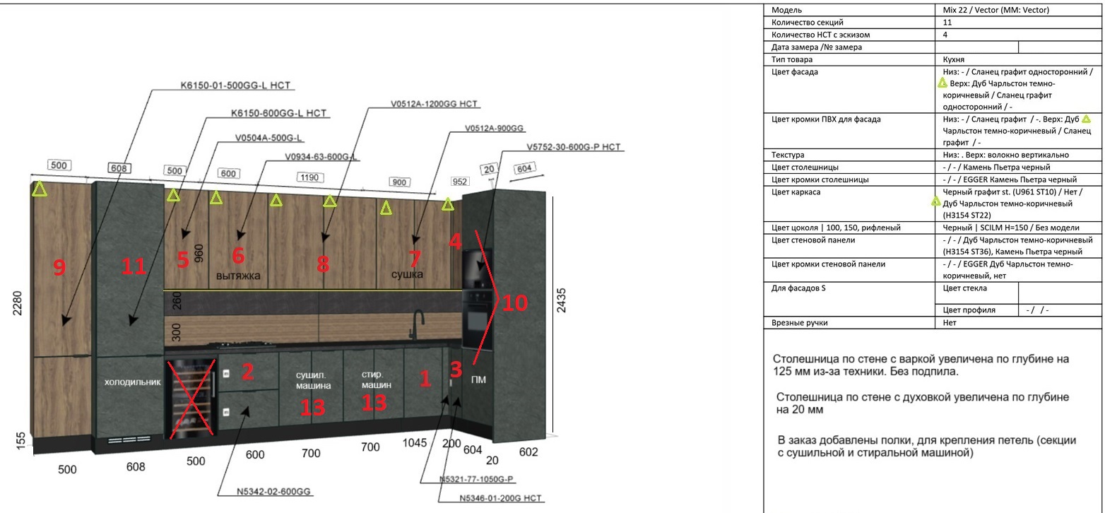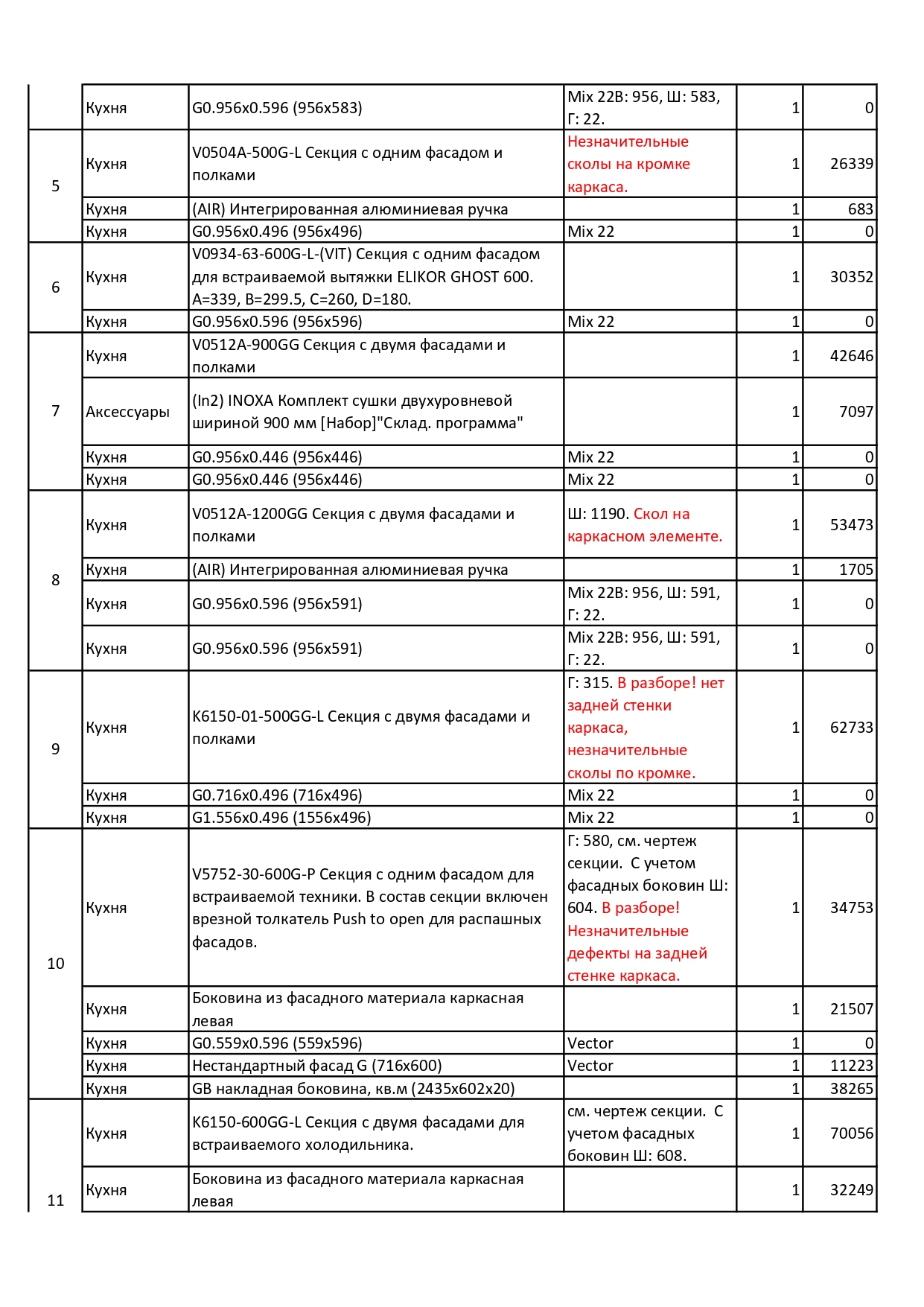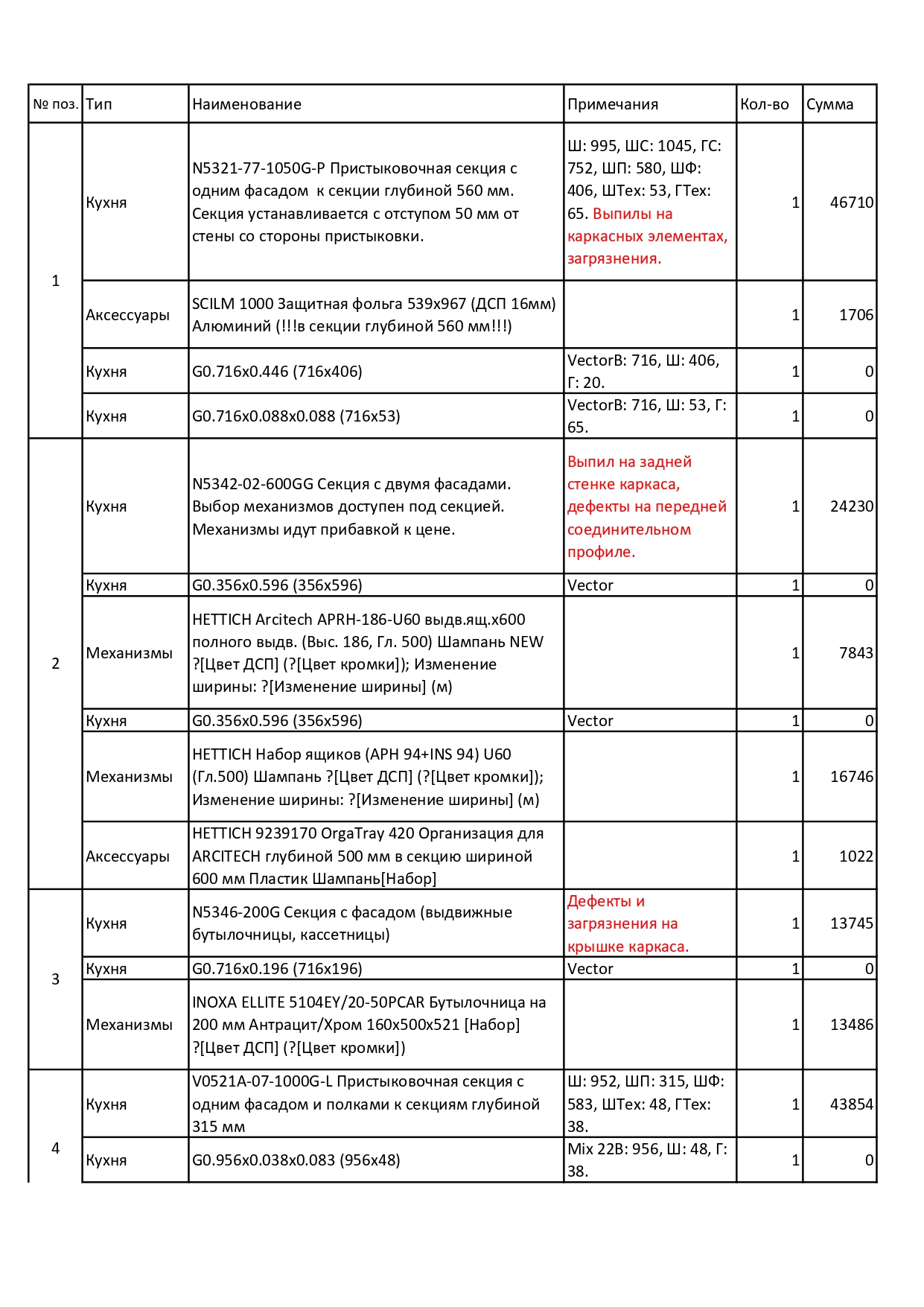 Внешний вид, описание дефектов: Кухонный гарнитур устанавливался! Эксплуатировался не длительный период. Имеются выпилы, установочные отверстия и незначительные загрязнения. В некоторых позициях гарнитура имеются дефекты. Дефекты указаны под номерами секций которые отражены на эскизе и прописаны в спецификации – в характеристиках товара! Во всех остальных позициях дефекты не обнаружены, могут присутствовать незначительные потертости, царапины. В секциях под технику предусмотрены только фасады, кроме винного шкафа. Все секции модульные, возможно изменение конфигурации в рамках данных комплектующих.