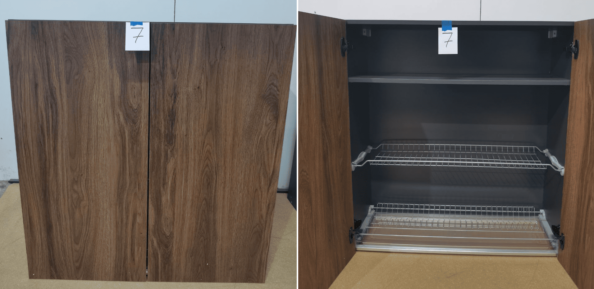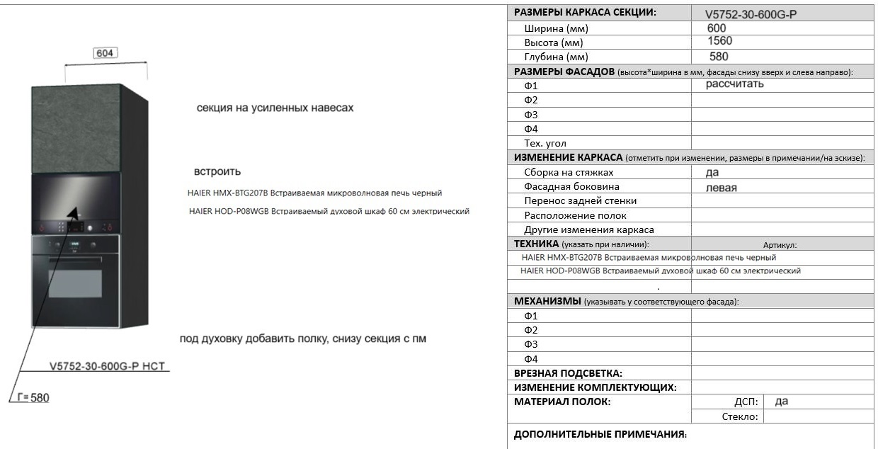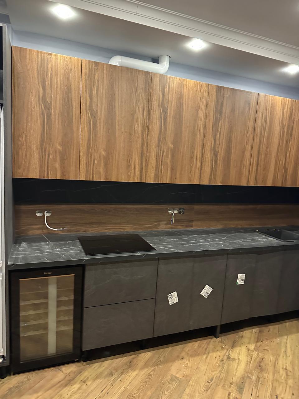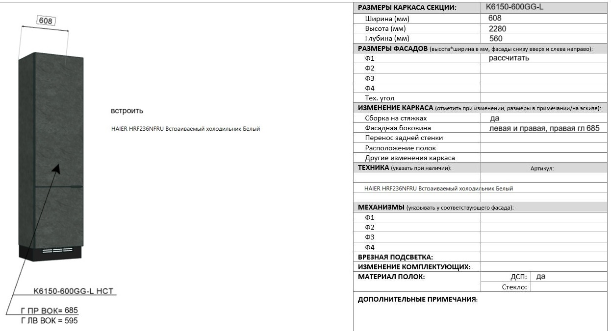 Внешний вид, описание дефектов: Кухонный гарнитур устанавливался! Эксплуатировался не длительный период. Имеются выпилы, установочные отверстия и незначительные загрязнения. В некоторых позициях гарнитура имеются дефекты. Дефекты указаны под номерами секций которые отражены на эскизе и прописаны в спецификации – в характеристиках товара! Во всех остальных позициях дефекты не обнаружены, могут присутствовать незначительные потертости, царапины. В секциях под технику предусмотрены только фасады, кроме винного шкафа. Все секции модульные, возможно изменение конфигурации в рамках данных комплектующих.