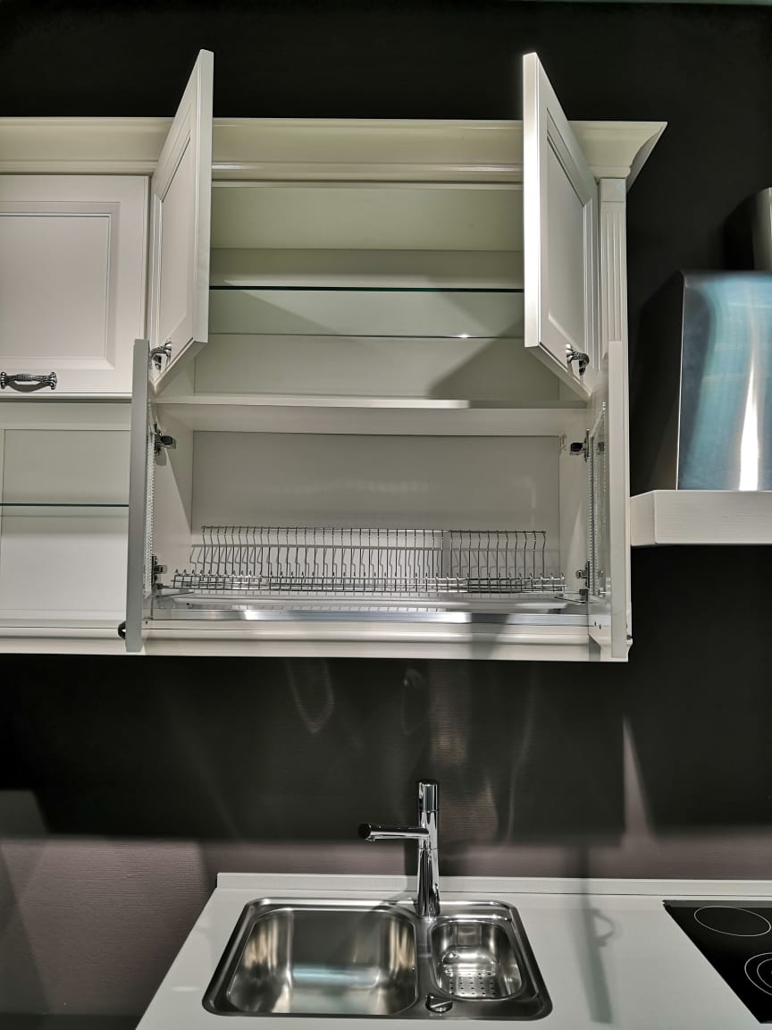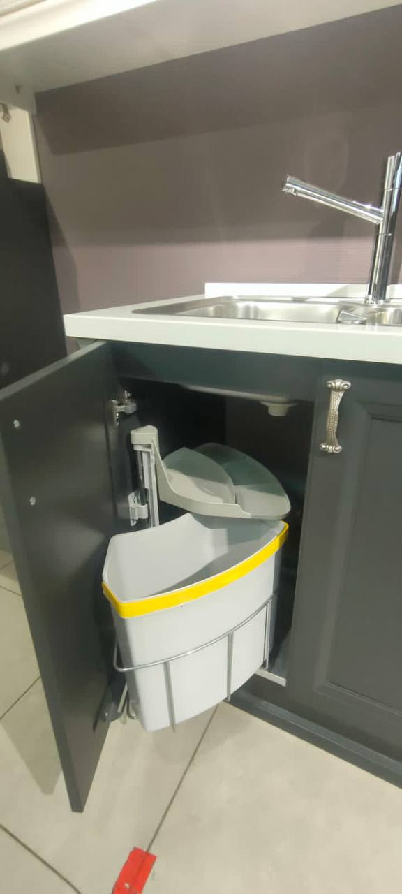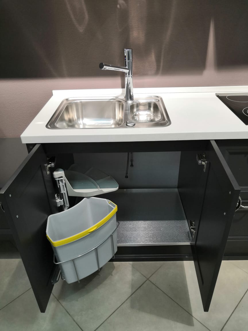 Комплектация: кухонный гарнитур с наполнением (мусорное ведро, сушилка), мойка и смеситель от фирмы BLANCO, механизмы, столешница.