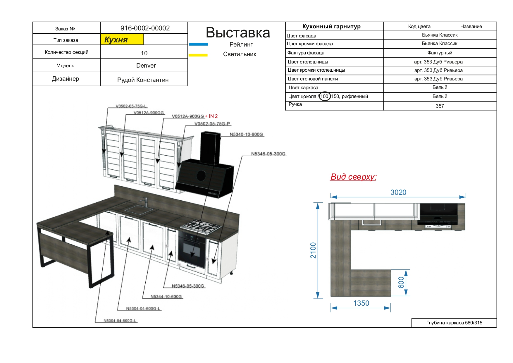 Размер Кухни: В/Ш/Г 2450/3020/600 мм.