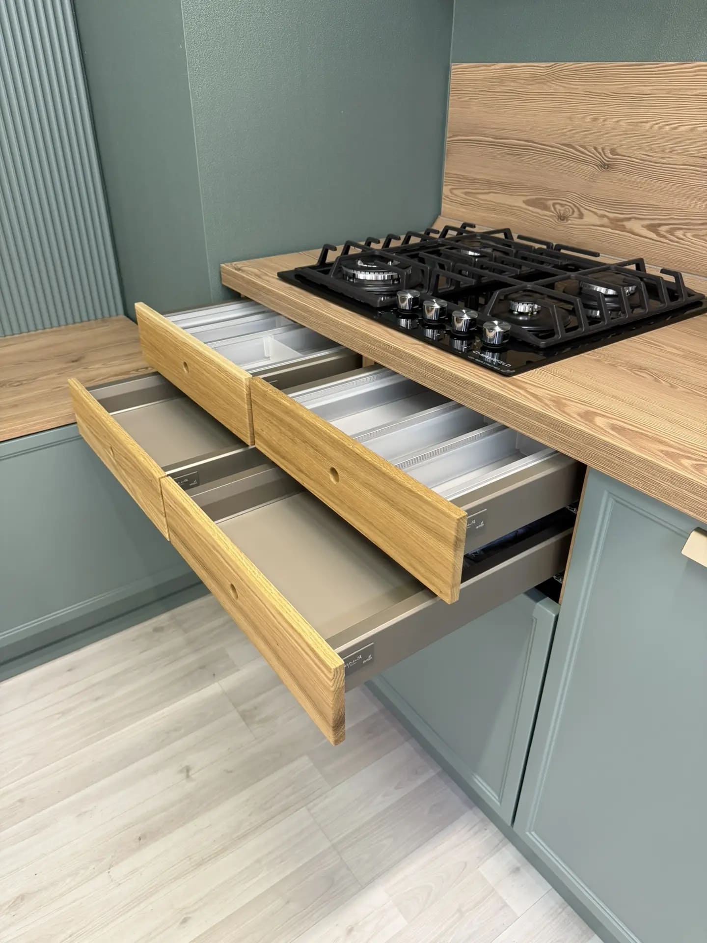 Фасады изготавливаются из МДФ толщиной 22 мм и покрываются сверху прочной, стойкой к истиранию эмалью. Поверхность может быть матовой, ультраматовой (софт-тач) или фактурной. В коллекции цветов — 10 эксклюзивных оттенков, разработанных специально для этой модели. Есть возможность покраски по палитрам RAL и NCS — это более 2000 вариантов.