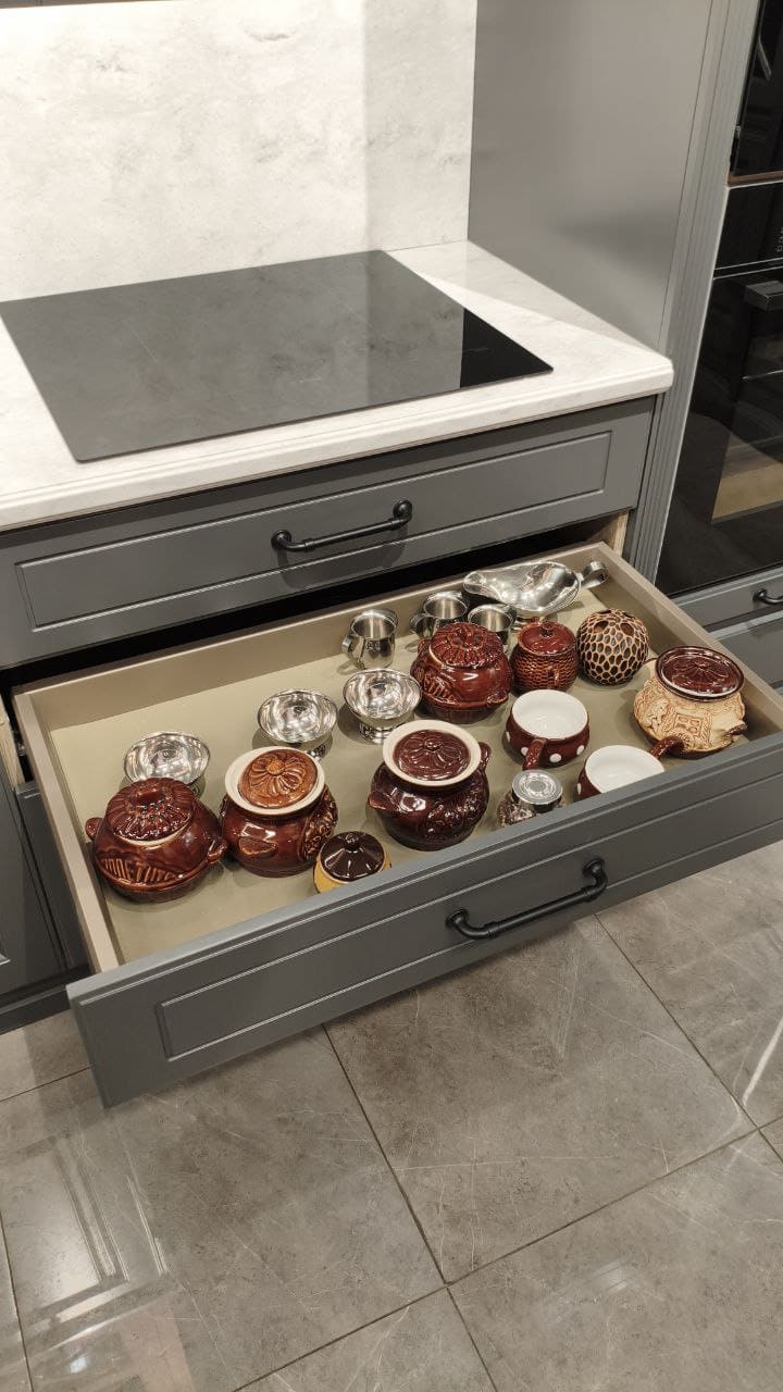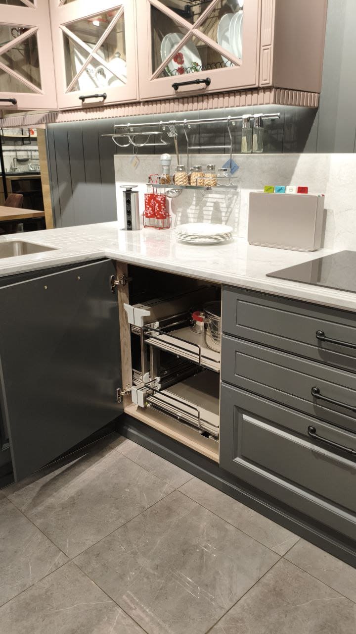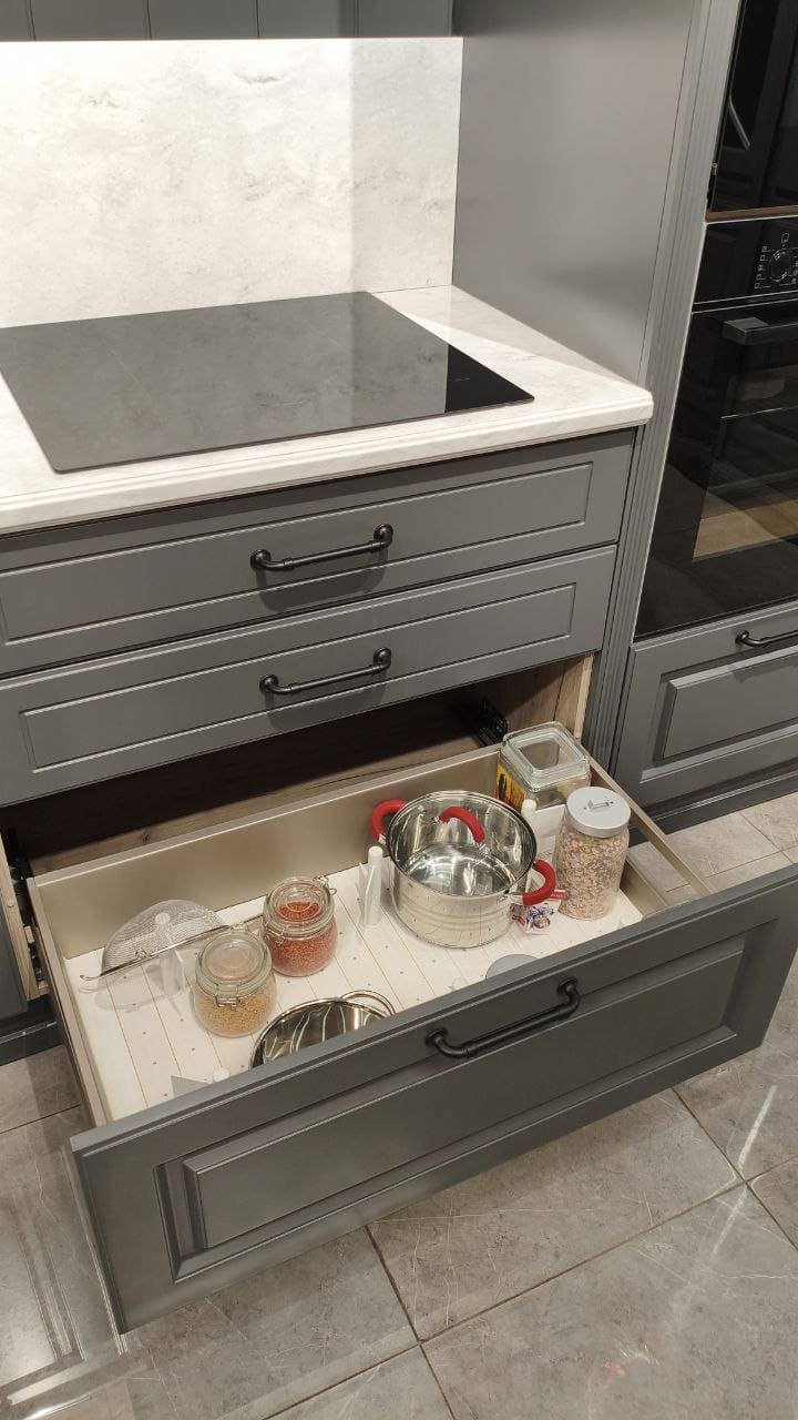 Внешний вид, описание дефектов: Фасад под мойкой не плотно закрывается, выпил в боковине под провод с заглушкой. Механизм в пристыковочной секции до конца не выдвигается, мешает фасад под мойкой. Могут присутствовать незначительные потертости, сколы, царапины. Люстра, ёмкости для печенья и бокалы не входят в данный комплект кухонного гарнитура.
