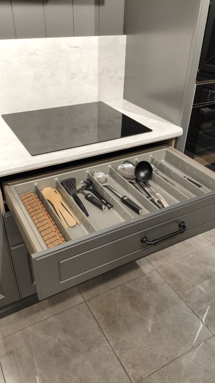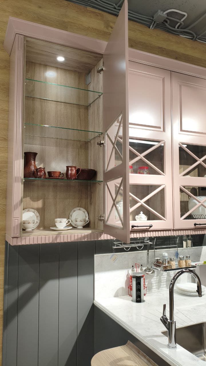 фасады, выполненные из МДФ 19 мм. Покрытие: матовая эмаль, дополнительное покрытие: глянец, мат. Внутренняя сторона матовая, в цвет фасада. Фасады могут патинироваться.