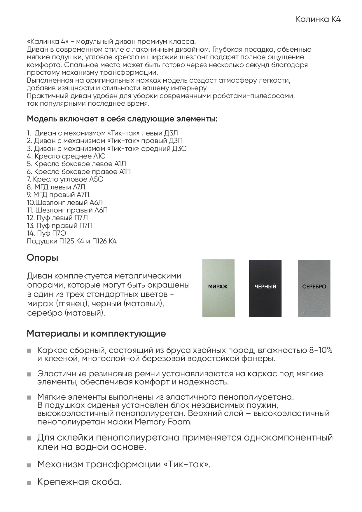 Мягкие элементы выполнены из эластичного пенополиуретана. В подушках сиденья установлен блок независимых пружин, высокоэластичный пенополиуретан. Верхний слой –высокоэластичный пенополиуретан марки Memory Foam.