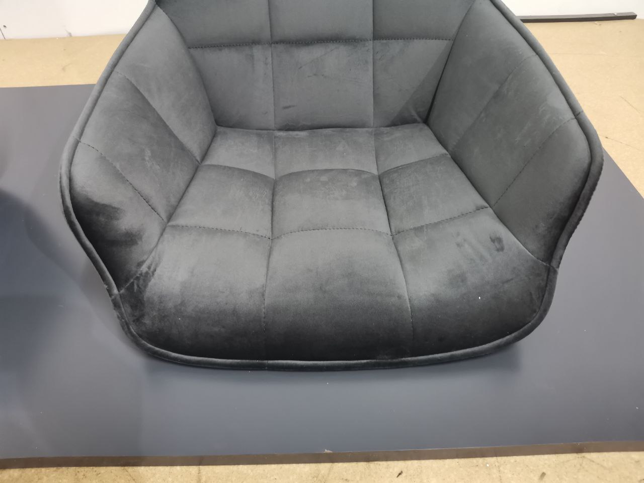 Дизайнерский стул с металлическим каркасом с поворотным сиденьем. Изготовлен в актуальной манере, обивка – люксовый велюр темно-серого цвета. Ножки из металлического сплава в виде расходящихся лучей. Обивка оформлена в оригинальной стеганной манере. Особенности данной модели стула - это высокая и объемная спинка, большие подлокотники, форма, напоминающая уютное кресло на ножках. А также наличие поворотного механизма сиденья, который позволяет занять максимально комфортное расположение. Повороты выполняются непринужденно, без шума и больших усилий. Продуманная конструкция для максимального уюта позволяет расслабиться и отдохнуть, сидя на таком стуле.