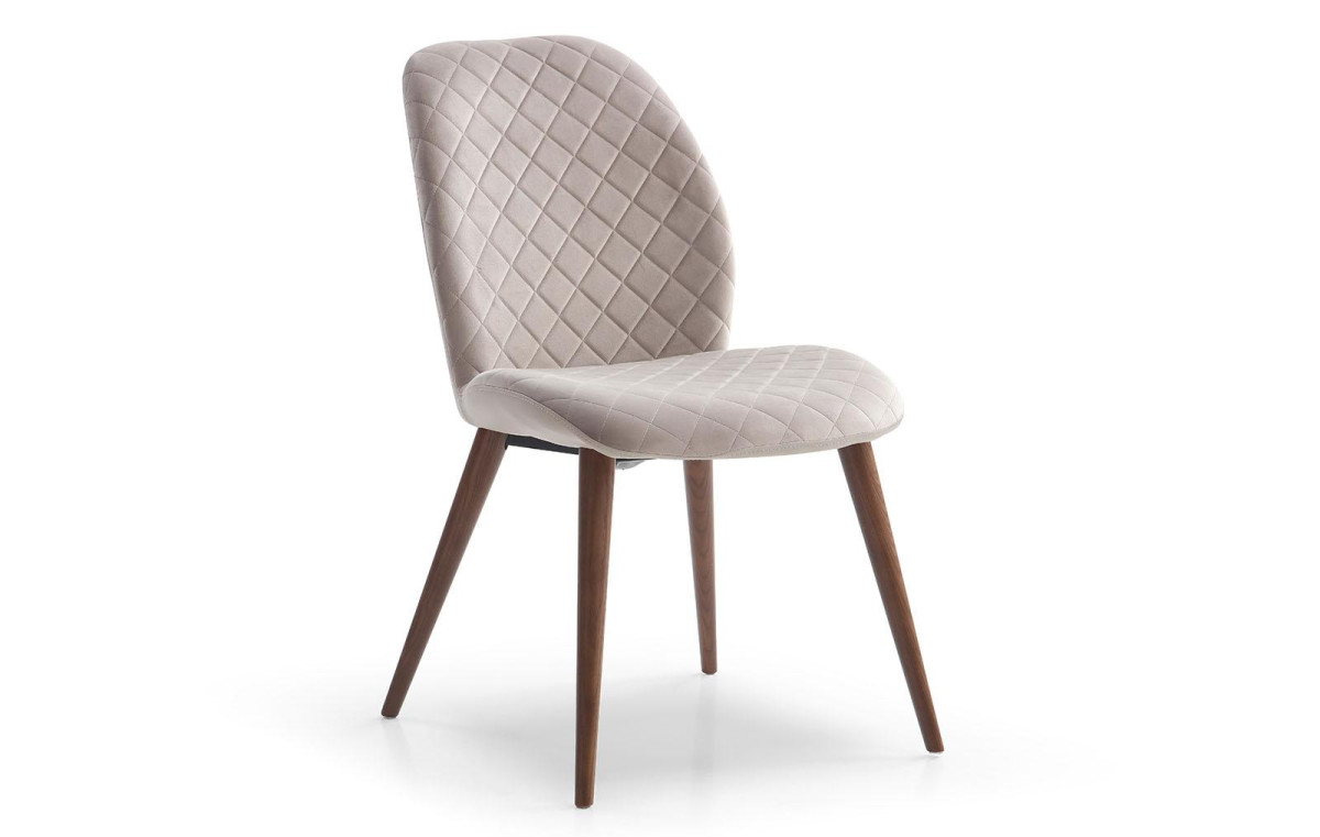Стул Berta (Берта) с комбинированной обивкой из приятного на ощупь велюра, красиво простеганного ромбами, с лицевой стороны и гладкой экокожи бежевого оттенка с задней части спинки – отличный выбор для кухни, гостиной, столовой или другой комнаты. На нем очень удобно сидеть благодаря высокой спинке с небольшим изгибом и мягкому сиденью.