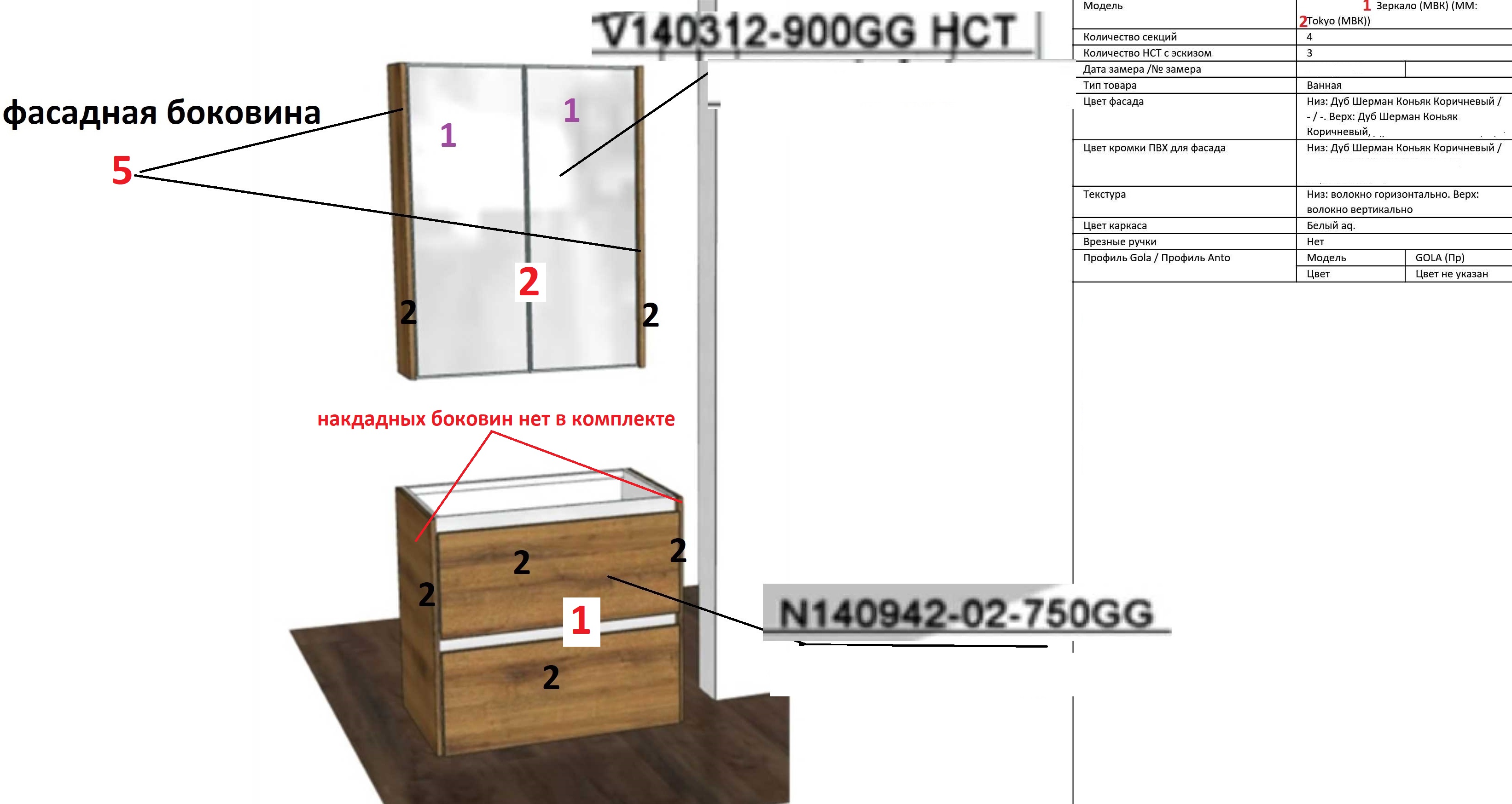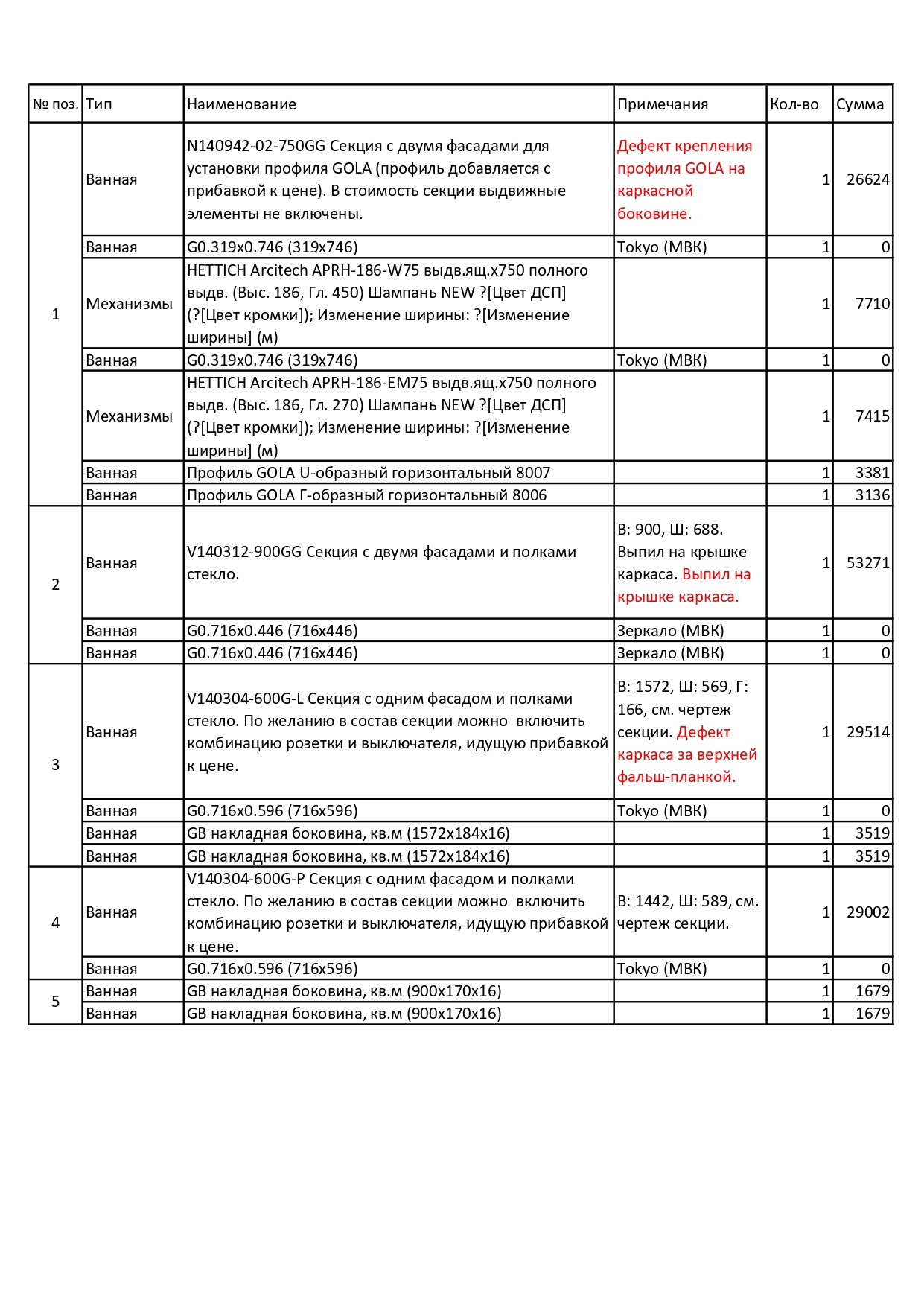 Внешний вид, описание дефектов: Мебель для ванной комнаты частично устанавливалась, не эксплуатировалась! Имеются установочные отверстия. В некоторых позициях имеются дефекты. Дефекты указаны под номерами секций которые отражены на эскизе и в спецификации. №1 Дефект крепления профиля GOLA на каркасной боковине. №2 Выпил на крышке каркаса. №3 Дефект каркаса за верхней фальш-планкой. Все секции модульные, возможно изменение конфигурации в рамках данных комплектующих
